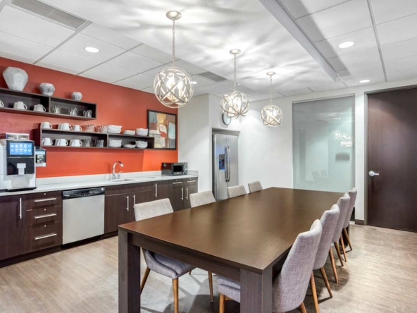 Inside, flexible private offices, coworking zones, and bookable meeting rooms come fully furnished and supported by on-site staff. Additionally, breakout areas, phone booths, and fully stocked kitchens sit alongside business-class printers and an on-site café for busy days. In addition, bike storage and showers back active commutes, while a wellness room and event space support team connection. Snack bars, recreational games, and lounge corners offer small moments of downtime between meetings.