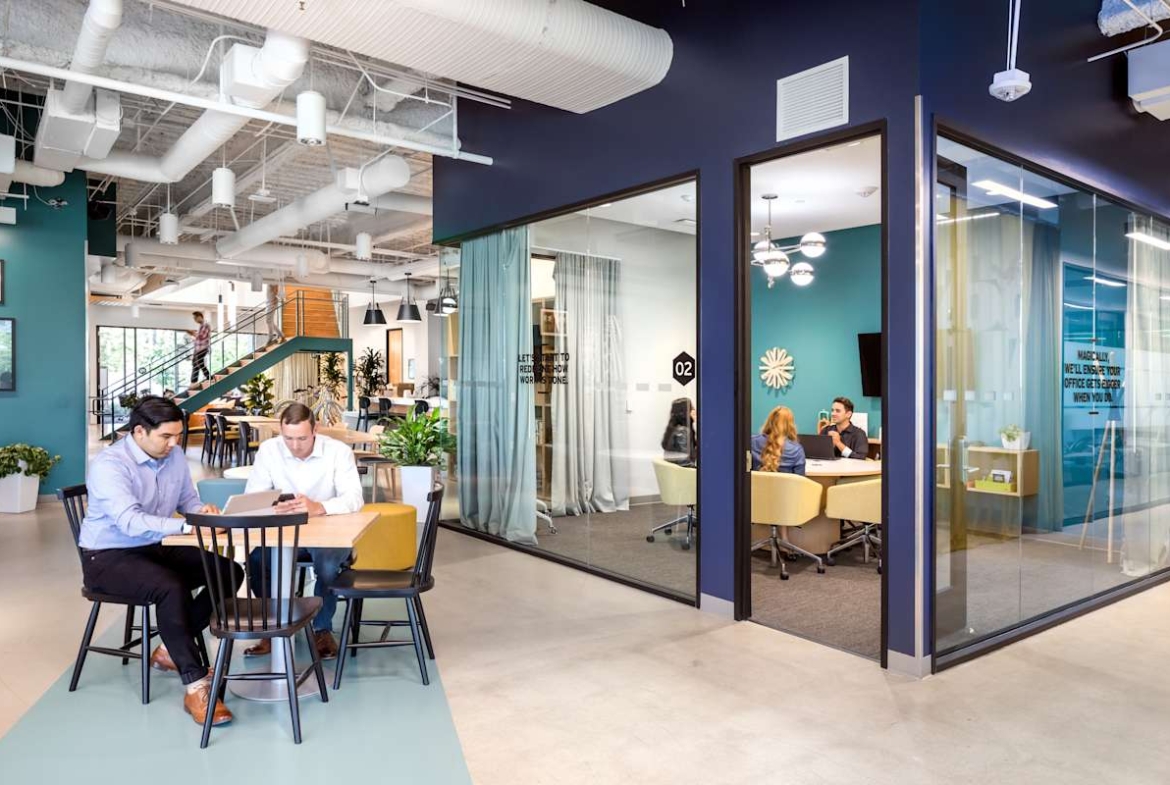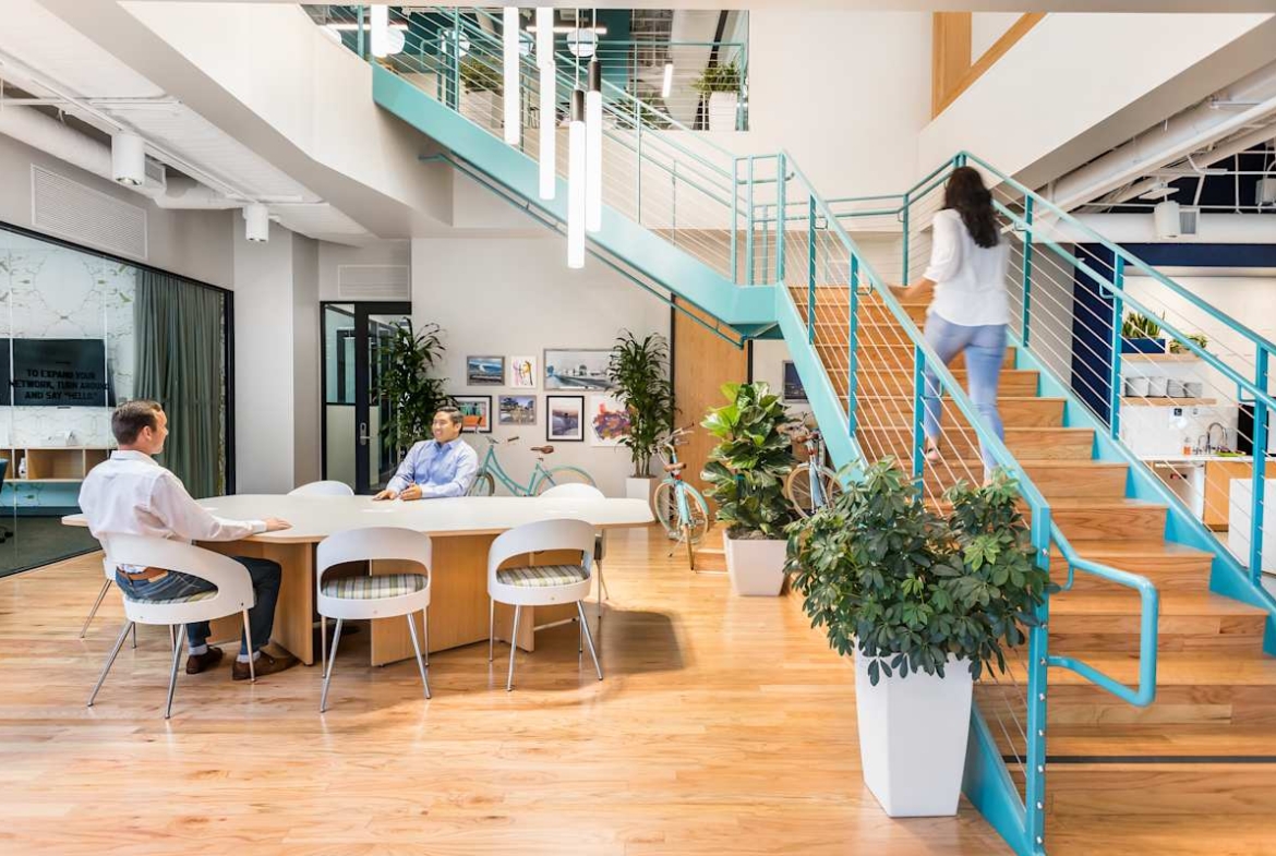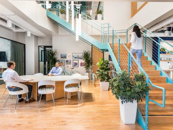 Inside, private offices, coworking areas, and serviced meeting rooms are ready to use. High-speed wi-fi, business‑class printers, phone booths, and on-site staff keep operations moving. In addition, breakout areas, fully stocked kitchens, an on-site cafe, and a snack bar make the day run smoothly. Showers, bike storage, and a wellness room support healthy, lower‑impact routines. Meanwhile, event space, networking events, and recreational games add variety to the workday.