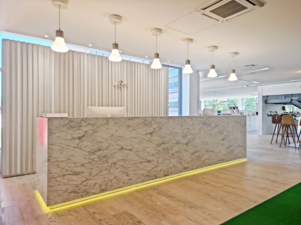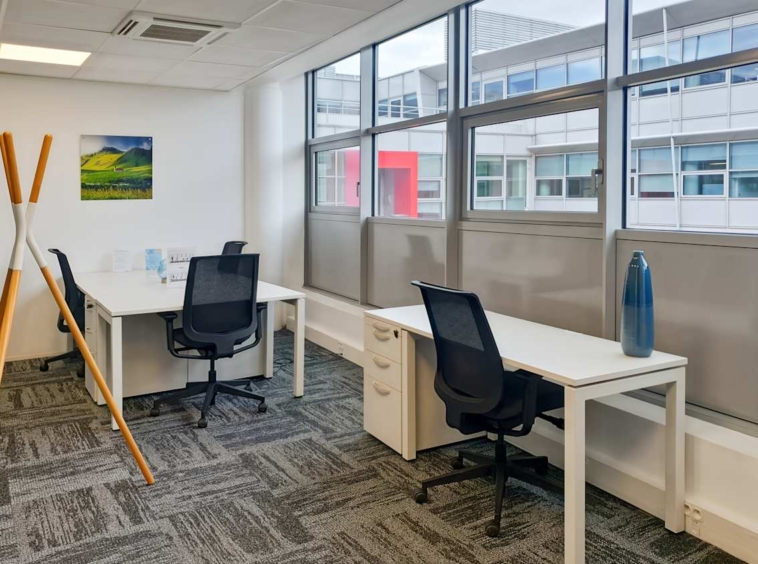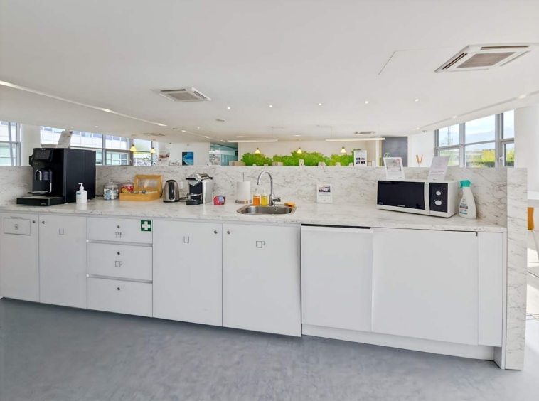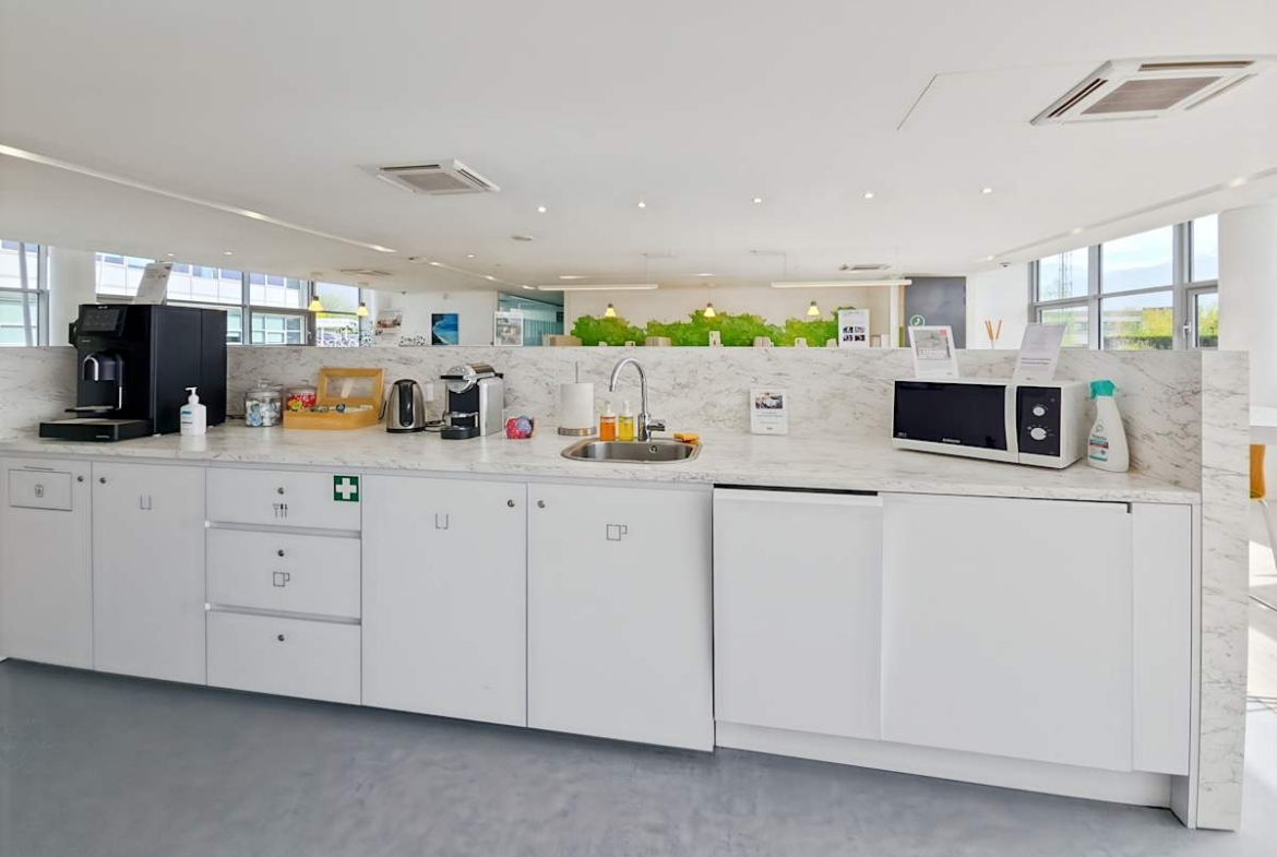 Inside, private offices, coworking areas, and bookable meeting rooms support different ways of working. In addition, breakout areas, a business lounge, and an on-site snack bar offer informal space for quick pauses. Lifts serve all levels, while suspended ceilings help keep cabling tidy and acoustics controlled. On-site parking supports both teams and visitors. Also, reliable Wi‑Fi and on-site support keep everything running smoothly.