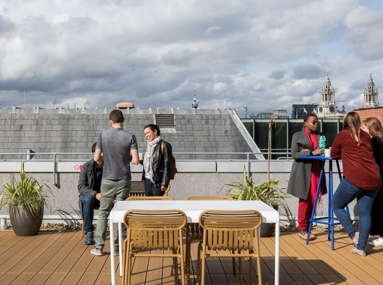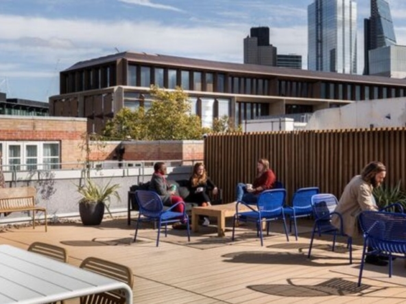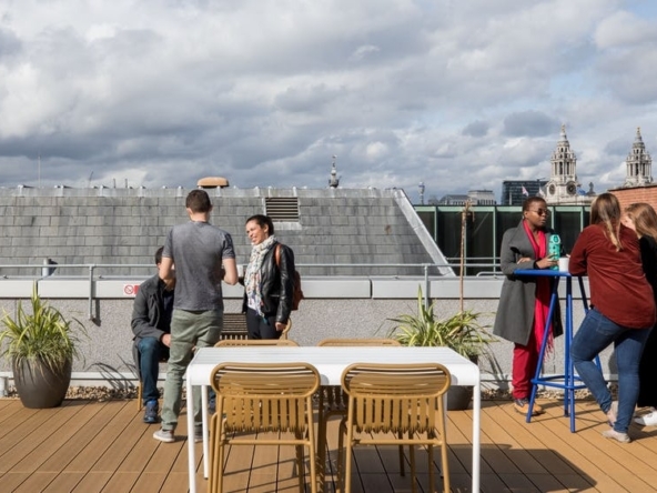 Inside, you’ll find high-speed Wi-Fi, soundproof phone booths, and a variety of meeting rooms equipped with the latest A/V technology. Each floor features a communal kitchen and soft seating areas, while the building includes a roof terrace with stunning views of London’s skyline. Additional amenities include a wellness room, recreational games, and lockers.