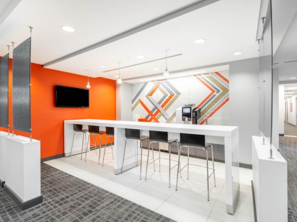 Inside, flexible private offices, coworking areas, and meeting rooms are fully furnished with high‑speed Wi‑Fi. In addition, breakout areas, fully stocked kitchens, phone booths, and business‑class printers support focused work and quick catch‑ups. Showers and bike storage back active commutes; meanwhile, an on‑site café, snack bar, event space, and networking help teams connect. Plus, a wellness room, recreational games, and on‑site staff keep days balanced and running smoothly.