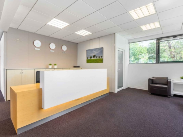 Inside, private offices, coworking areas, and bookable meeting rooms support a range of workstyles. Also, a business lounge, breakout areas, and a convenient snack bar offer relaxed spaces to pause or meet. High-speed Wi‑Fi, on-site support, and suspended ceilings for tidy services keep the workspace practical and comfortable. In addition, floor-to-ceiling windows bring ample natural light and views of greenery throughout the day.