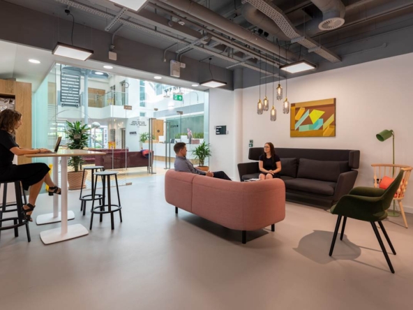 The building’s contemporary design features tall windows and an open layout that fills the space with natural light. Inside, you’ll find private offices, coworking areas, and meeting rooms available on demand. Additionally, a stylish business lounge and dramatic extra-height atrium create inviting spaces for informal meetings or quick catch-ups. Fully furnished offices come ready with high-speed internet and utilities included, allowing teams to start work without delay.