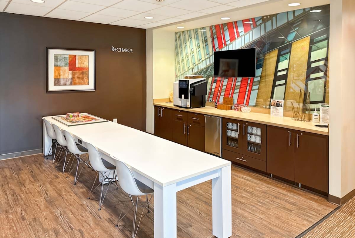 Nearby, Friendly Center offers shops, groceries, cafés, and banking, with gyms and services within minutes. Also, the Bog Garden and Greensboro Arboretum are close for quick walks between meetings. In addition, meeting clients off-site is simple with cafés and casual dining across the street. 717 Green Valley Road offers a well-connected base for teams in Greensboro.