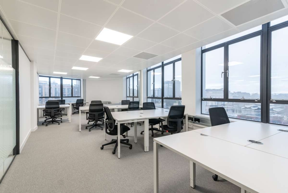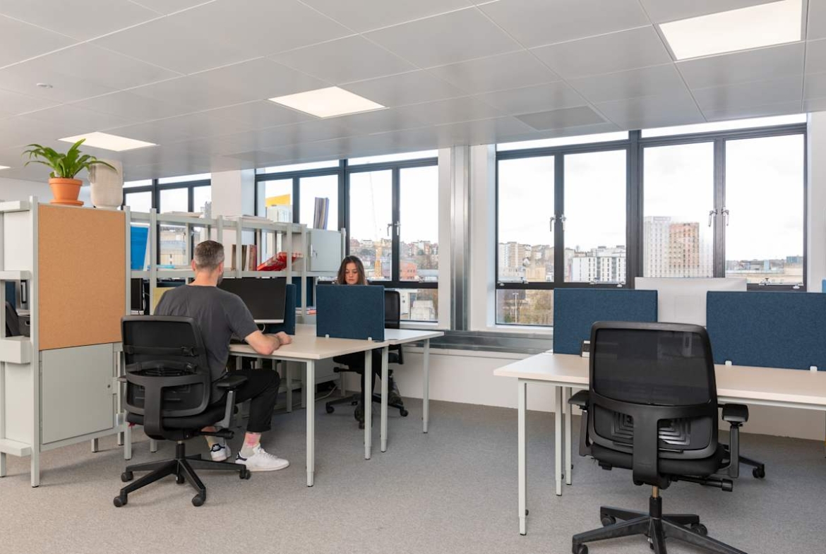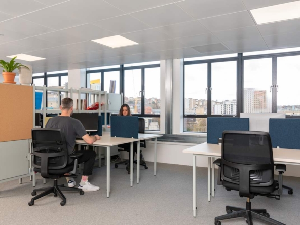 The offices occupy the top three floors of this distinctive curved structure. Businesses can choose from private offices or collaborative coworking spaces, all fully furnished and ready to use. High-speed Wi-Fi and ergonomic furniture support productivity from day one. A spacious patio and informal breakout areas provide space for casual meetings or quiet breaks. Secure cycle storage and nearby bus routes make commuting simple and sustainable.