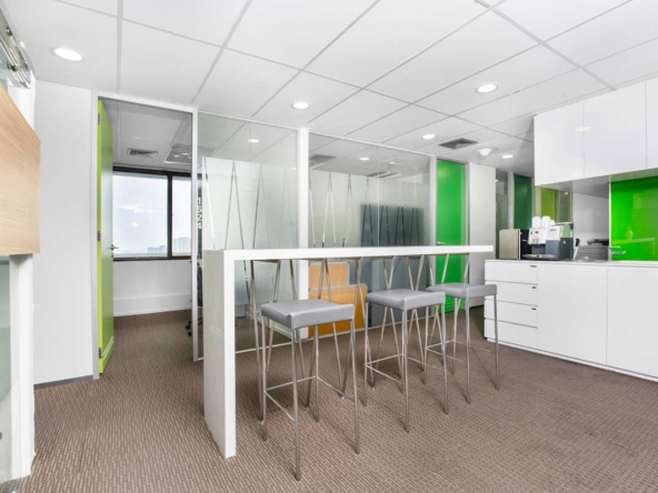 Inside, private offices, coworking areas, and furnished meeting rooms support varied ways of working. High-speed wi-fi, business-class printers, and on-site staff keep daily operations on track. Breakout areas, phone booths, and fully stocked kitchens sit alongside event space, an on-site cafe, and a snack bar. In addition, showers, bike storage, and a wellness room encourage healthy, low-impact commutes and routines.