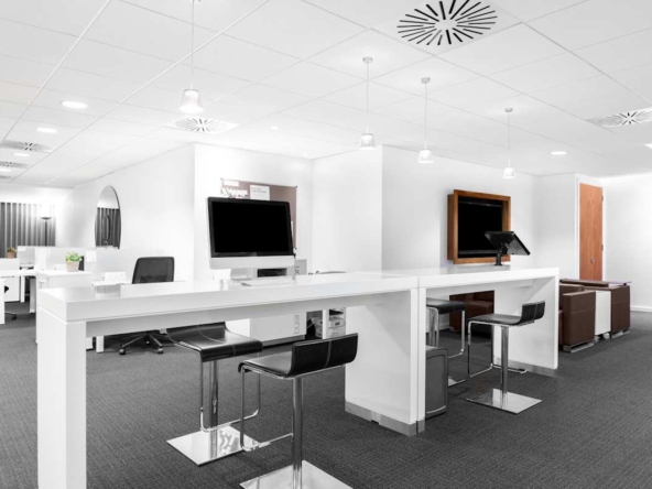 Inside, you’ll find a modern walk-in business lounge, complete with comfortable seating, high-speed Wi-Fi, and charging points. A dedicated coffee bar is available for quick refreshments while catching up on emails or preparing for client meetings. The space is designed for short, productive stops, whether you need an hour of focused work or a private meeting area.