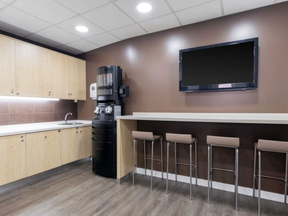 Inside, private offices, coworking areas, and bookable meeting rooms are complemented by breakout areas and a comfortable business lounge, with generous natural light from the façade. In addition, a snack bar supports quick refuels between sessions, while suspended ceilings help manage acoustics and lighting effectively. Therefore, teams can settle in quickly and focus on work throughout the day.