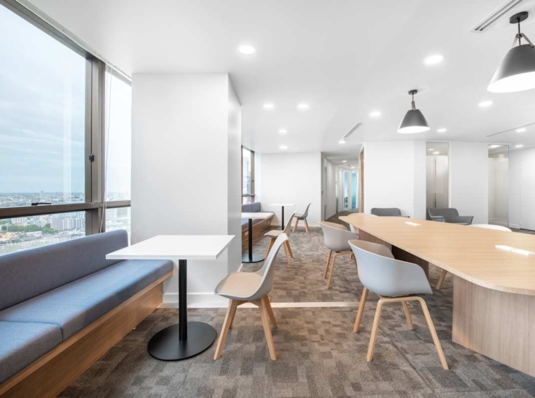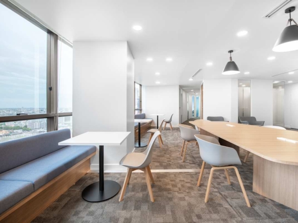 Inside, you’ll find offices with floor-to-ceiling windows overlooking the Chao Phraya River. The stylish interiors feature warm wood finishes and flexible layouts, with options including private offices, open-plan coworking areas, and fully equipped meeting rooms with AV technology for presentations and team workshops.
