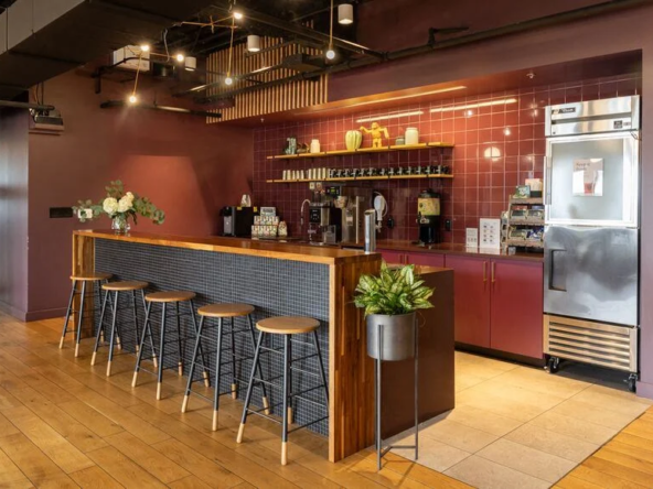 Inside, private offices, coworking areas, and meeting rooms are ready to use with high-speed, reliable Wi-Fi and ergonomic seating. In addition, on-site staff, a staffed reception, and a mobile app support daily operations on every floor. Breakout areas, phone booths, a business lounge, and fully stocked kitchens sit alongside event space and bike storage that supports low-carbon travel.
