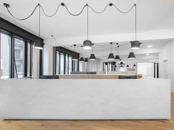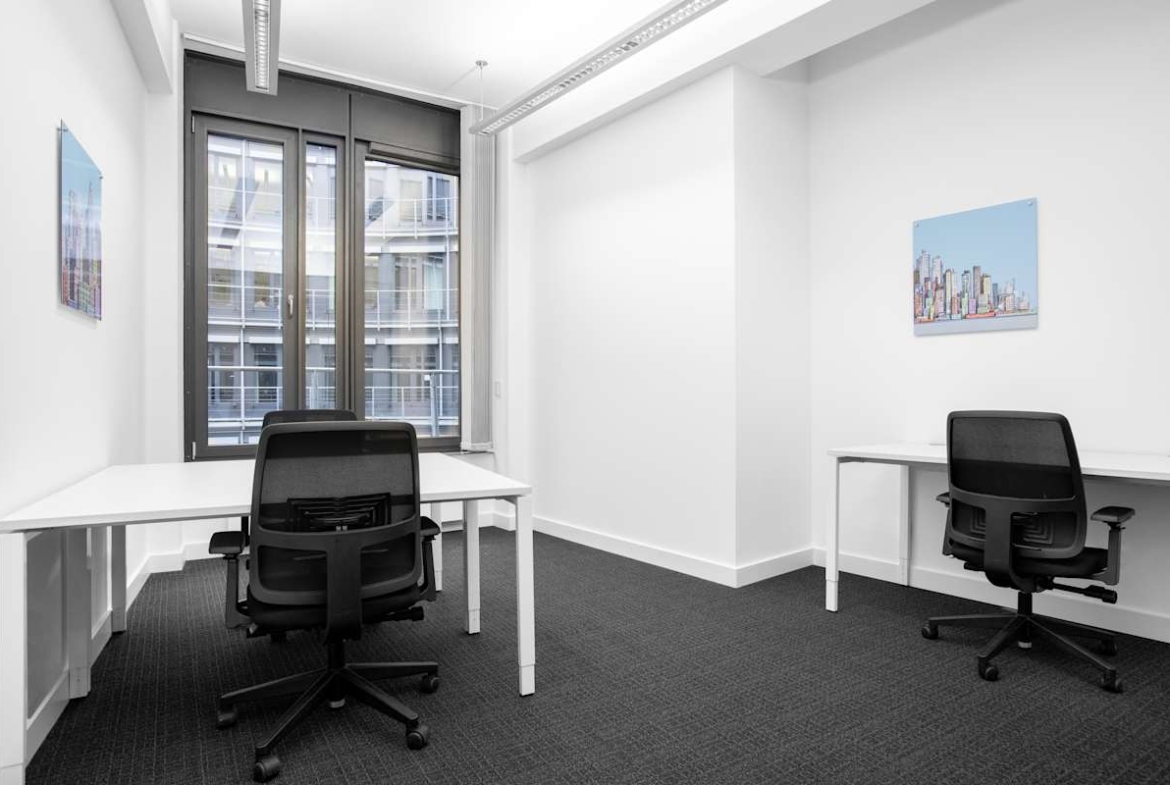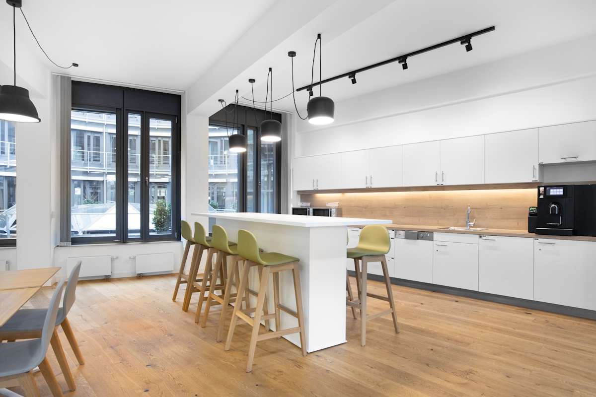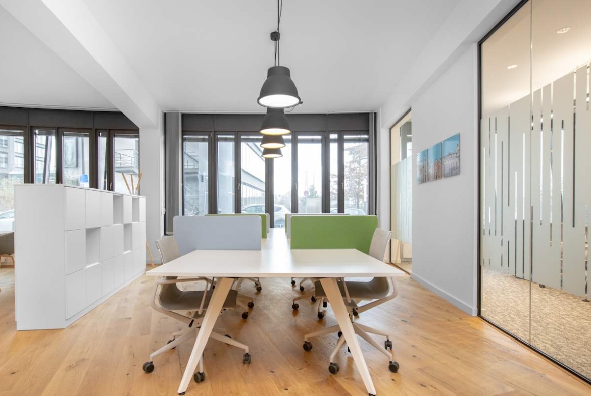 Inside, the building features private offices, coworking areas, and meeting rooms, supported by high-speed Wi-Fi. Floor-to-ceiling windows bring in natural light, while shared kitchens and breakout areas create informal spaces for coffee breaks and team discussions. A rooftop garden offers panoramic views of Munich, ideal for relaxing between meetings or hosting informal gatherings. An ID card access system helps maintain security throughout the building.