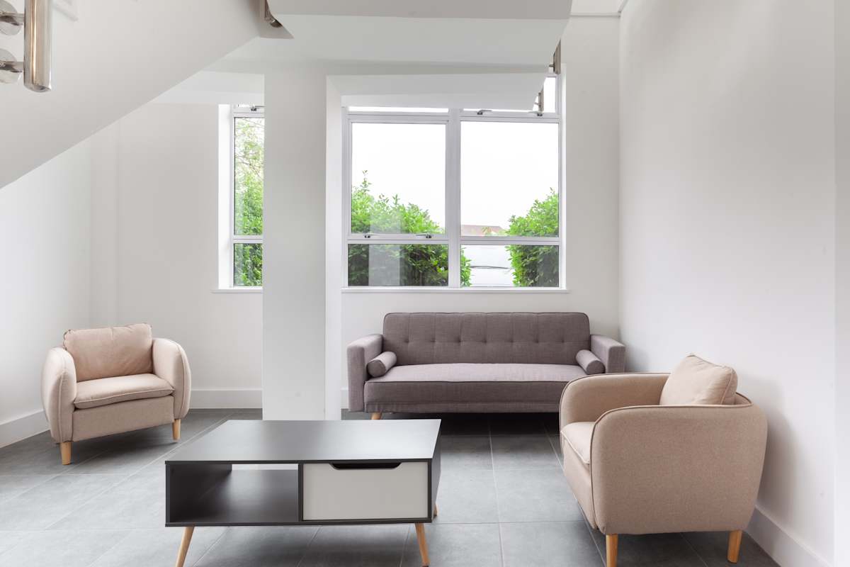The building provides a range of modern workspaces, from private offices to shared coworking areas. Large windows allow natural light to fill the interiors, creating a bright and welcoming environment. Facilities include fully equipped meeting rooms, high-speed internet, and comfortable breakout spaces for informal conversations or solo work. On-site parking and secure bike storage make commuting simple for your team and visitors.