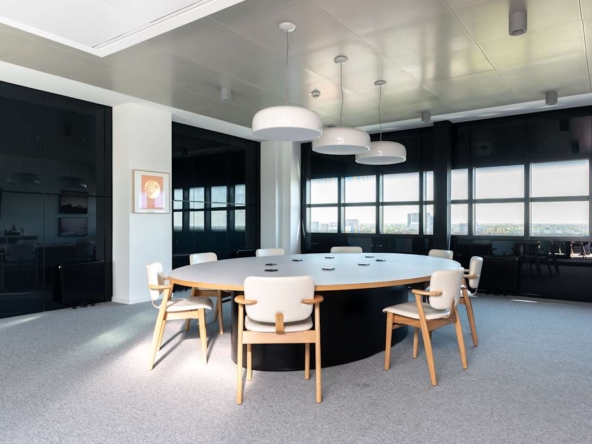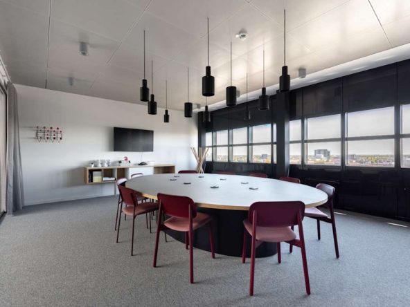 The building features private offices, coworking areas, and fully equipped meeting rooms. Large windows fill the workspaces with natural light, while high-speed internet keeps teams connected. Quiet booths provide space for focused tasks, and informal breakout areas support team collaboration. Reception staff manage visitor arrivals and day-to-day services, while cleaning and maintenance are included. The property also offers 24-hour access for businesses needing flexible schedules.