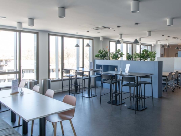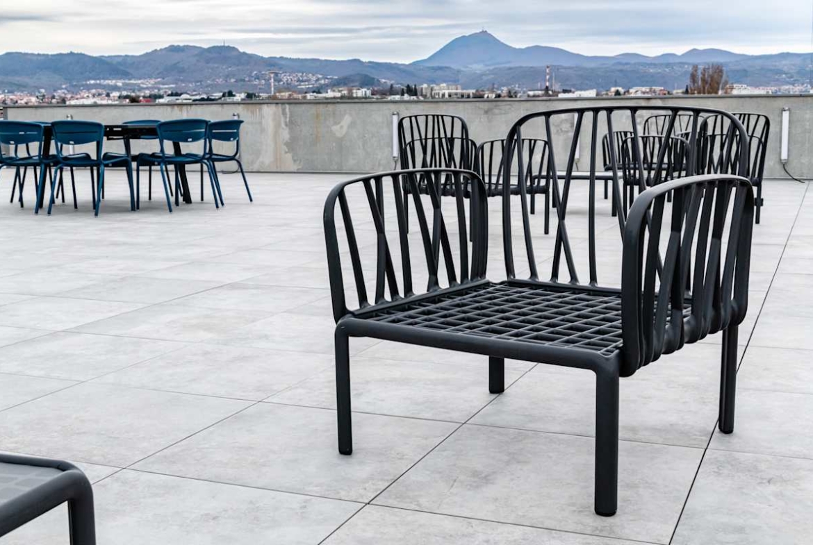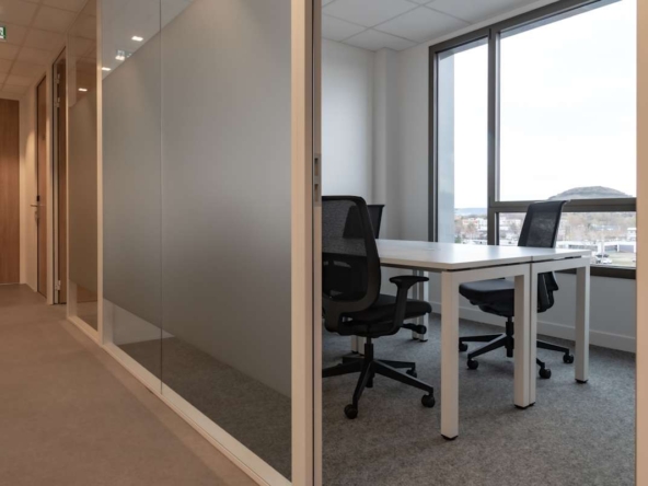 Inside, private offices, coworking areas, and meeting rooms are fully serviced and ready to use. High-speed Wi‑Fi and ergonomic furniture support focused work, while breakout areas and a business lounge offer relaxed spaces. In addition, bike storage, showers, and the 250 m² rooftop with views of Puy‑de‑Dôme support active, low‑carbon routines. Raised flooring, suspended ceilings, CCTV monitoring, wheelchair access, lifts, a gym, and on-site parking round out the specification.
