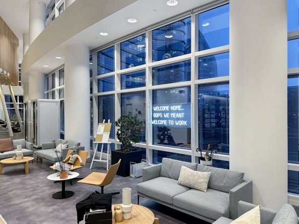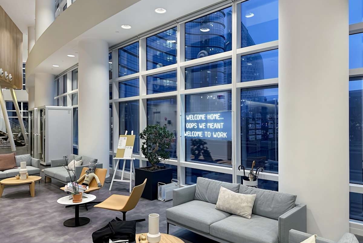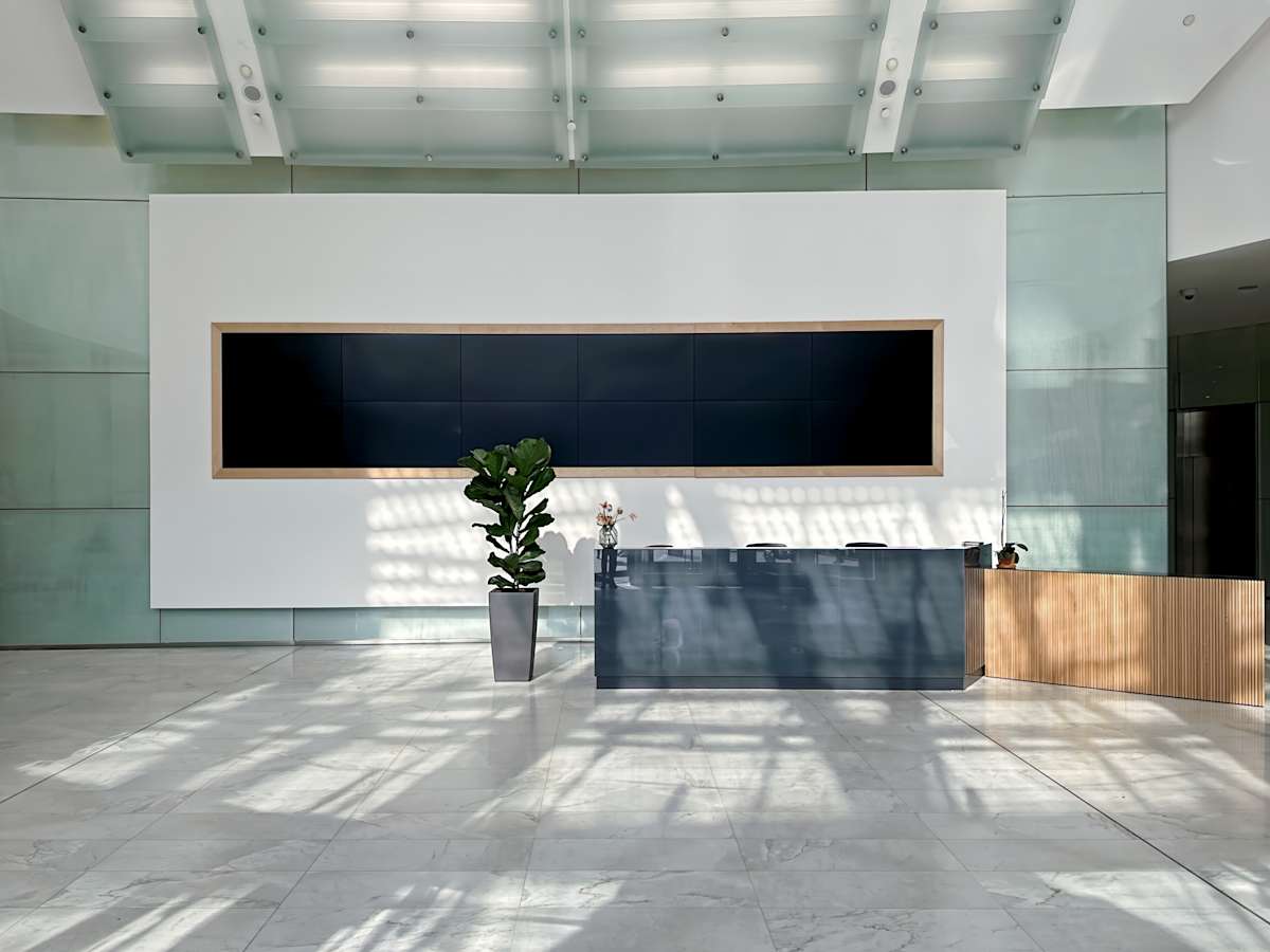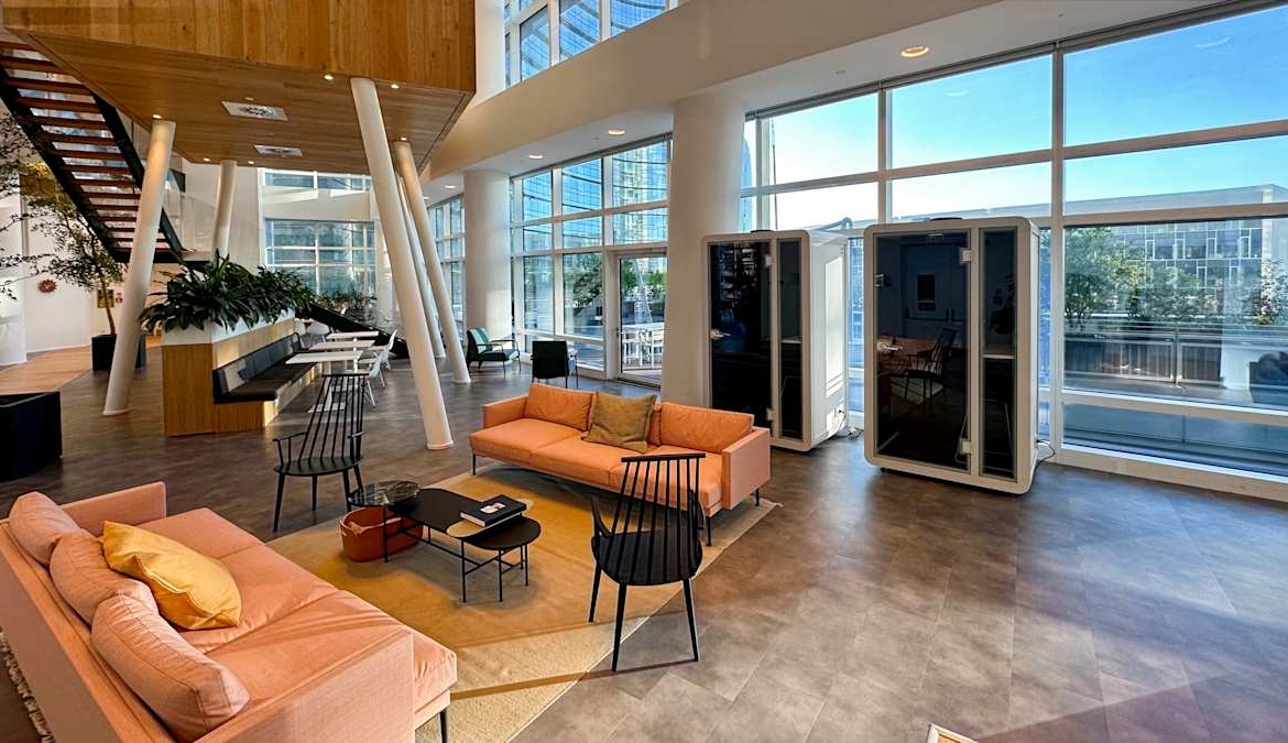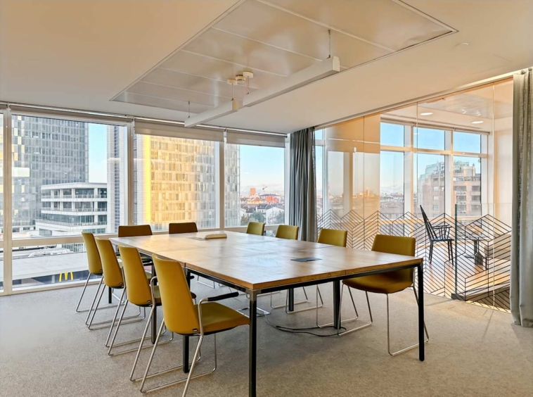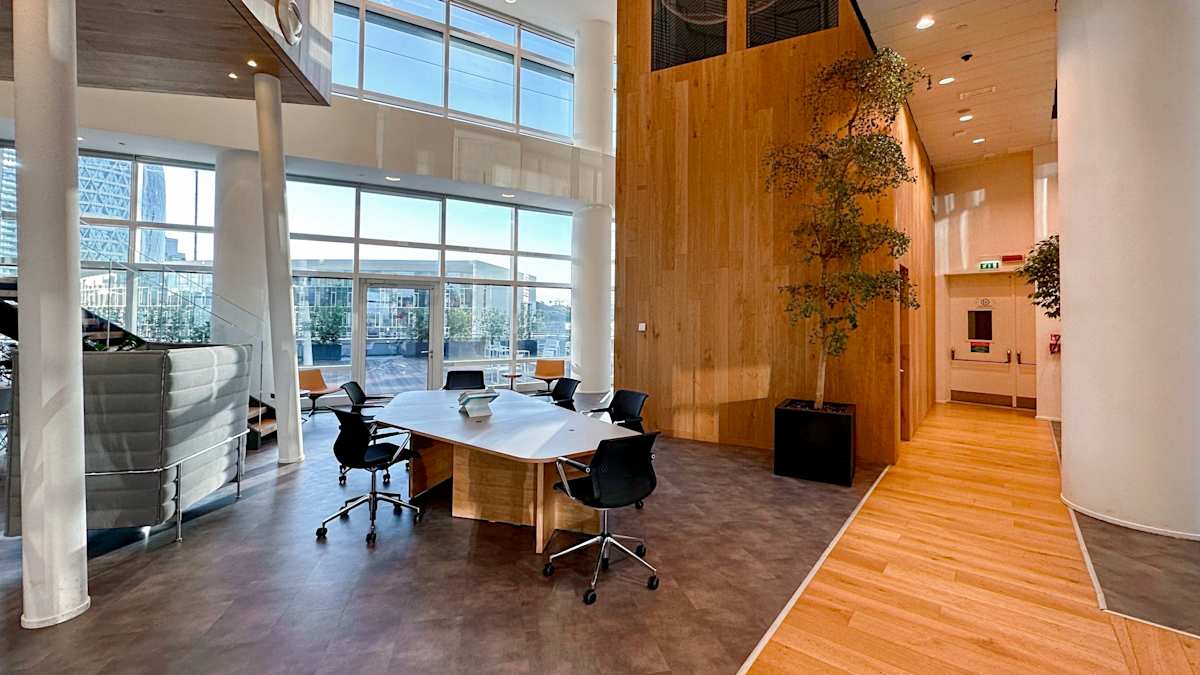 The building’s striking contemporary design creates a standout presence in the district. Inside, flexible workspace includes private offices, coworking areas, and meeting rooms arranged for both focused work and collaboration. Floor-to-ceiling windows fill the space with natural light and offer views across the city. High-speed Wi-Fi and modern meeting technology support daily operations and client presentations.