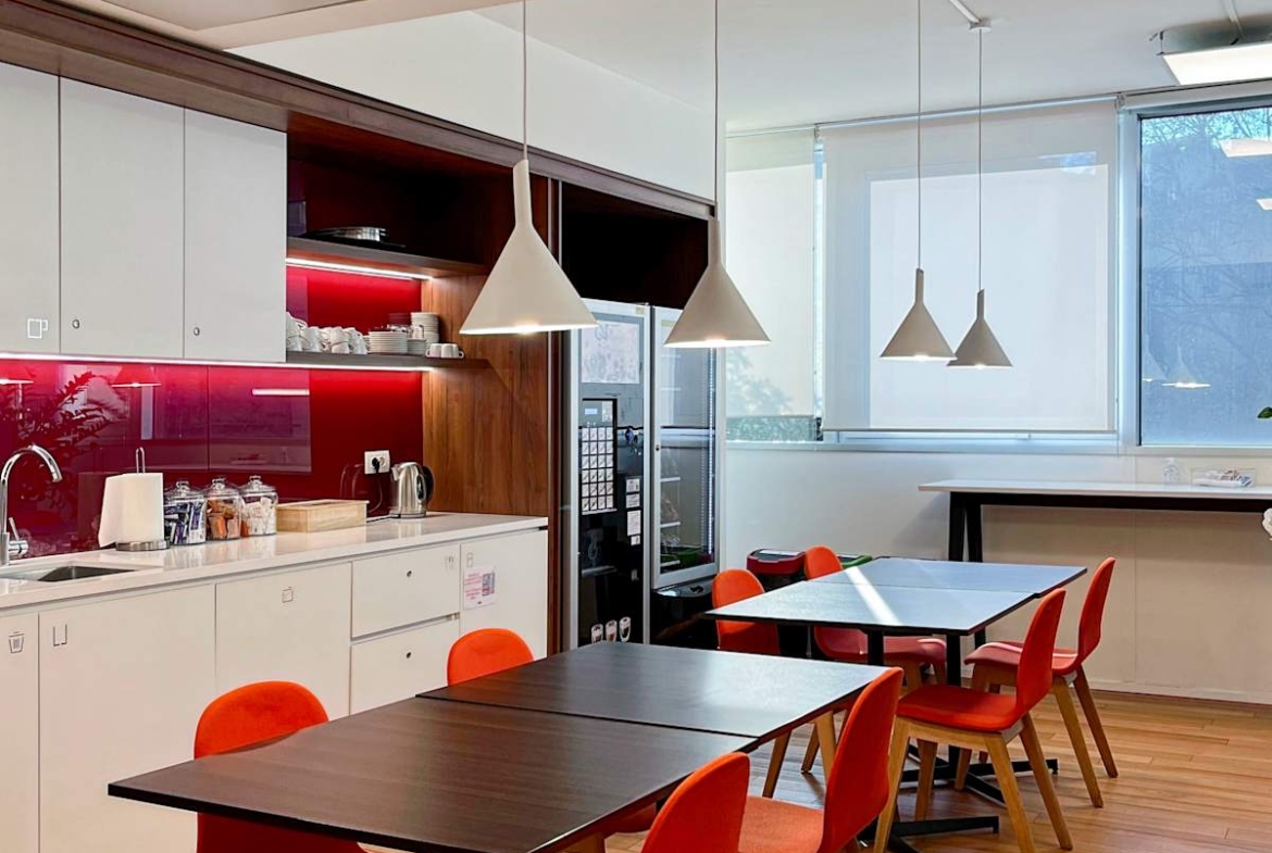 The building features a natural stone ground floor with a glass-fronted façade rising above, creating a modern and distinctive look. Inside, private offices, meeting rooms, and coworking areas provide flexible workspace options. High-speed Wi-Fi runs throughout, while breakout areas and shared kitchens offer informal spots for collaboration and quick breaks. A terrace adds an extra space for outdoor meetings or time away from the desk.