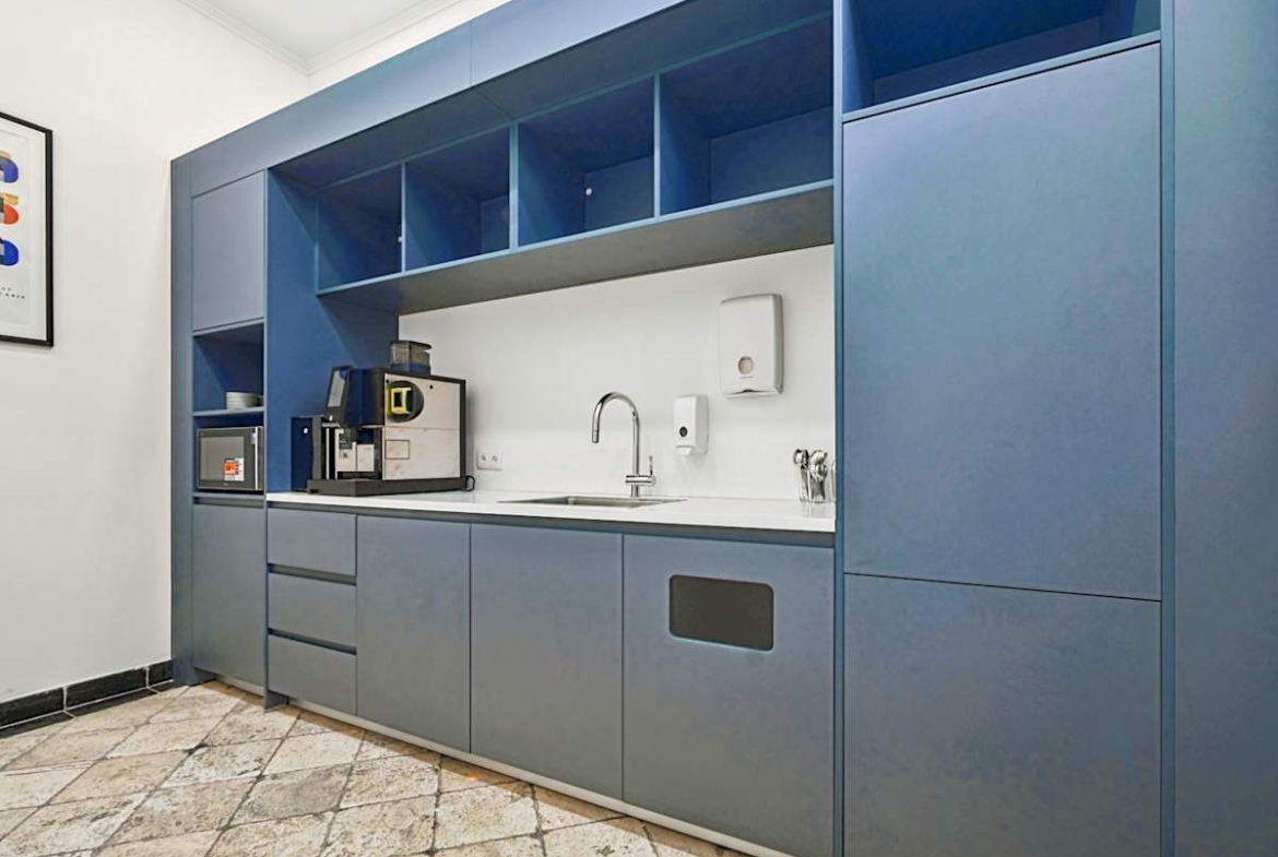 Inside, private offices, coworking areas, and bookable meeting rooms sit across three light-filled floors. In addition, a terrace, breakout areas, and stocked kitchens make space for quick resets and informal catch-ups. High-speed Wi‑Fi, ergonomic furniture, and an on‑site team support the day, while showers, bike storage, and recycling points encourage lower-impact commutes and habits.