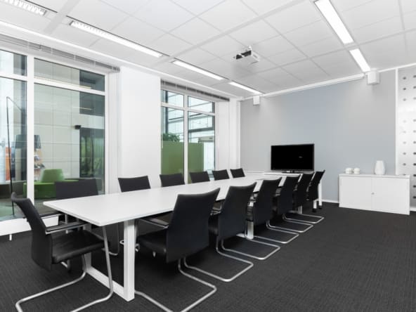 Inside, private offices, coworking areas, and bookable meeting rooms support different ways of working. Breakout areas and a quiet business lounge offer space to reset, while a snack bar keeps days running smoothly. In addition, raised flooring aids tidy cabling, wheelchair access supports step‑free movement, and landscaped views extend to an outdoor terrace.