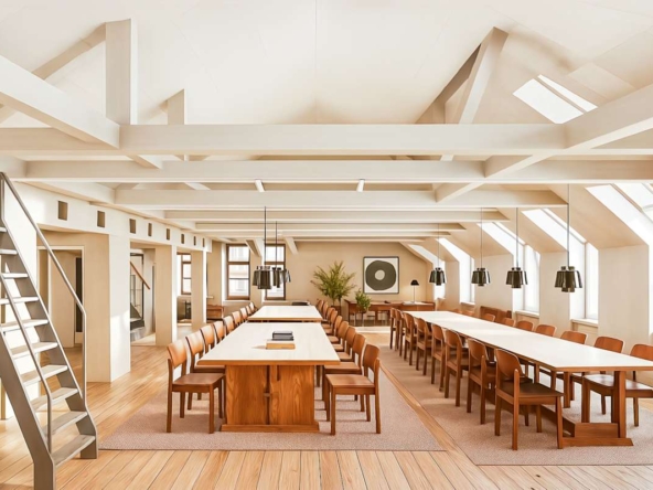 Inside, private offices, coworking areas, and bookable meeting rooms are ready to use from day one. High-speed Wi‑Fi, ergonomic furniture, and a staffed reception sit alongside admin support and business‑class printers. In addition, breakout areas, a business lounge, event space, and fully stocked kitchens keep teams comfortable throughout the day. Meanwhile, a gym, wellness room, and a podcast studio support wellbeing and content needs. Sustainability features include recycling points in communal kitchens and efficient utilities management.