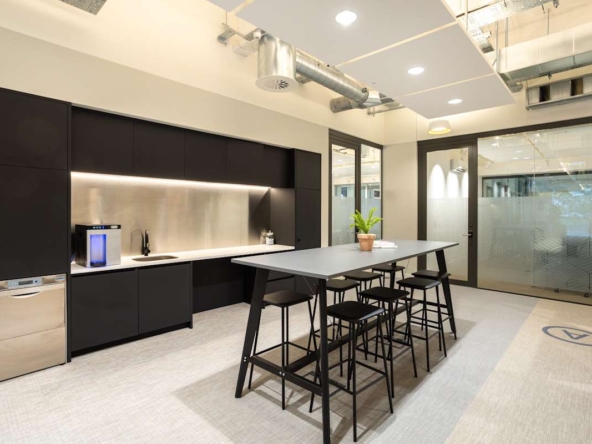 The building features a bright, open atrium with a variety of flexible workspace options, including private offices, coworking desks, and meeting rooms. High-speed internet and ergonomic furnishings help with productivity, while the on-site coffee bar provides a convenient spot for quick breaks or informal chats.