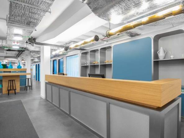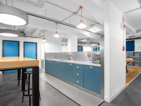 The building spans 11 floors and includes private offices, coworking areas, and meeting rooms. A staffed reception welcomes visitors and manages deliveries, while high-speed Wi-Fi supports day-to-day operations. Breakout spaces and shared kitchens provide informal areas for team discussions and quick breaks. An on-site gym is also available for staff use. Cleaning and maintenance are included, ensuring a smooth experience for tenants.