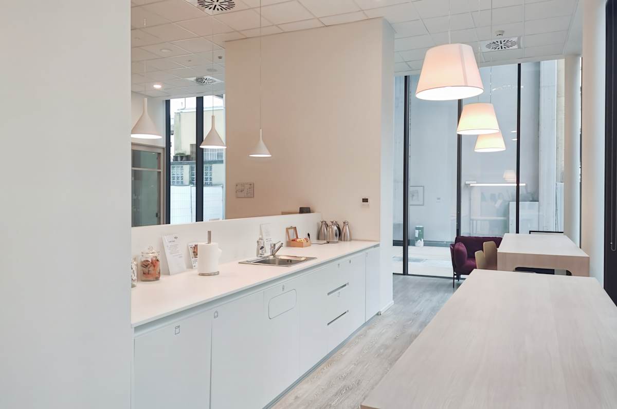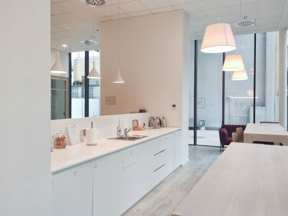 The building spans eight floors, each filled with light and designed for productivity. Private offices, coworking areas, and meeting rooms are available on flexible terms. High-speed Wi-Fi supports day-to-day work, while shared kitchens and breakout areas provide informal spots for collaboration. A roof terrace offers a stylish setting for team breaks or networking.