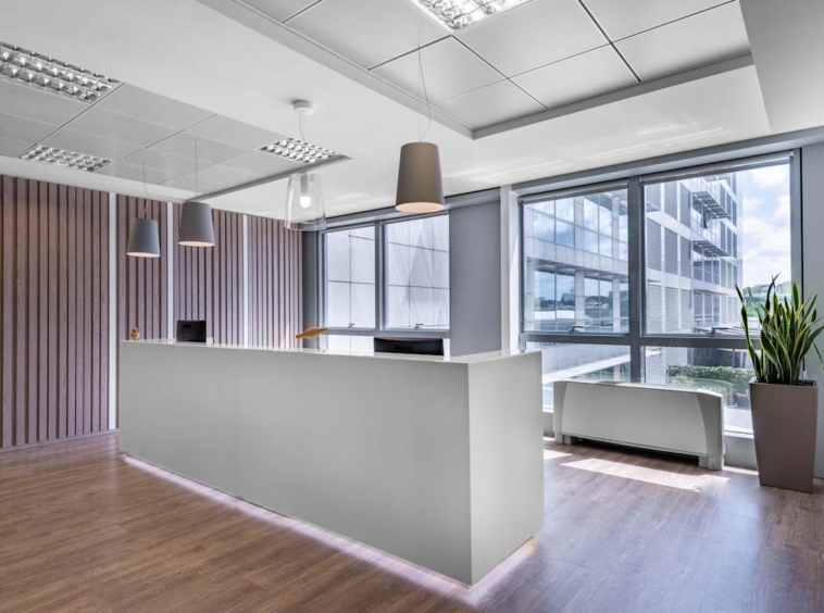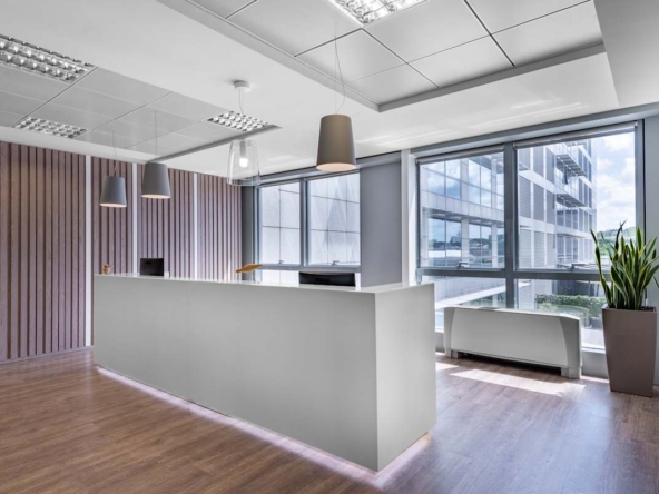 The building includes private offices, coworking areas, and meeting rooms designed for everyday business use. Large windows bring natural light into the workspaces, while breakout areas and shared kitchens offer informal spots for team discussions or coffee breaks. On-site staff manage reception, cleaning, and maintenance, allowing teams to focus on their work. Secure on-site parking is available for those commuting by car.